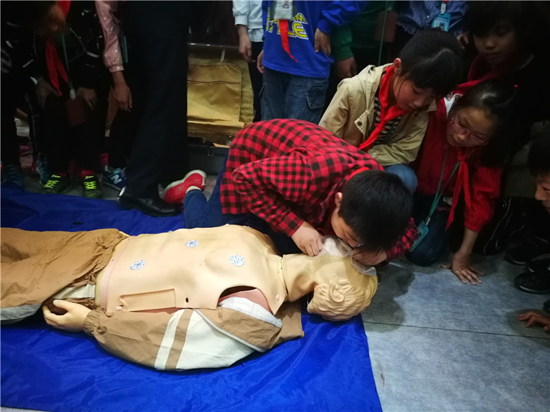 龚站长和救护人员还为师生进行了心肺复苏术的现场演示,并邀请同学进行现场体验,手把手地指导学生正确有效地施救。实践操作调动了同学们的积极性,大家纷纷上台,学习心肺复苏的急救技能。