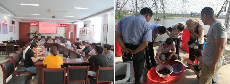 最后,水产党支部专家党员现场查看了水质、水草及小龙虾生长情况等,就当前养殖生产注意事项向基地负责人提出了指导意见。